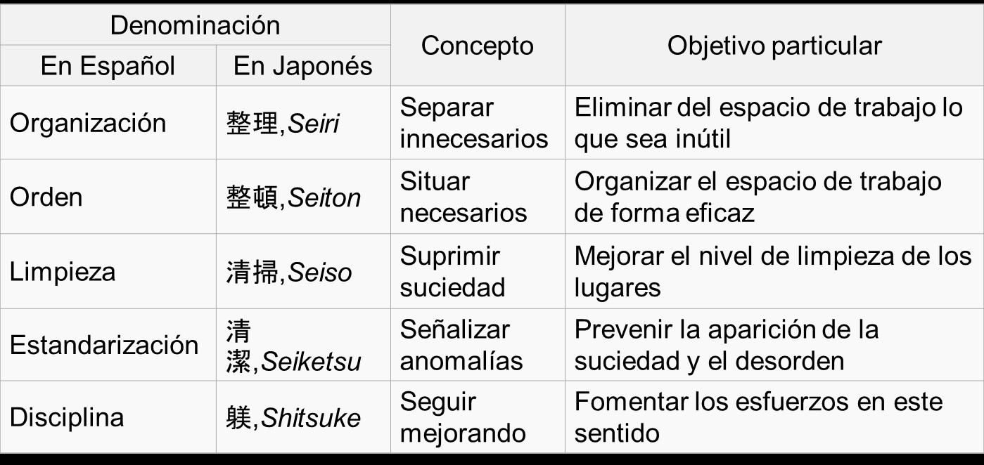 Se denominan “5´S”, a 5 conceptos que en japonés comienzan con la letra “S” y que están